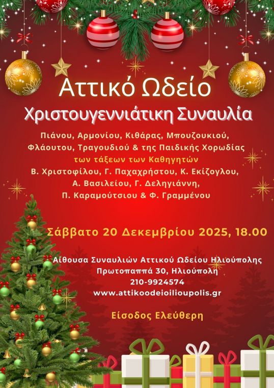 🎄Χριστουγεννιάτικη συναυλία σπουδαστών πιάνου, αρμονίου, κιθάρας, μπουζουκιού, φλάουτου & της παιδικής χορωδίας, των τάξεων των καθηγητών Β. Χριστοφίλου, Γ. Παπαχρήστου, Κ. Εκίζογλου, Α. Βασιλείου, Γ. Δεληγιάννη, Π. Καραμούτσιου και Φ. Γραμμένου, θα πραγματοποιηθεί το Σάββατο 20 Δεκεμβρίου 2025, στις 6.00μμ, στην αίθουσα συναυλιών του Αττικού Ωδείου Ηλιούπολης (Πρωτοπαπά 30, Ηλιούπολη).