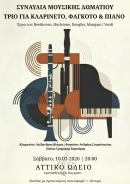 Mε μεγάλη χαρά σας προσκαλούμε σε Συναυλία Μουσικής Δωματίου, Τρίο για Κλαρινέτο, Φαγκότο & Πιάνο, το Σάββατο 10 Ιανουαρίου 2026 στις 20.00, στην αίθουσα συναυλιών του Αττικού Ωδείου. Οι μουσικοί της Εθνικής Λυρικής Σκηνής Αλέξανδρος Βλάχος στο κλαρινέτο και Ανδρέας Σπυρόπουλος στο Φαγκότο αλλά και ο εξαίρετος σολίστ και καθηγητής στο Πανεπιστήμιο της Tampa της Florida Γρηγόρης Ζαμπάρας στο πιάνο, θα σας παρουσιάσουν χαρακτηριστικά έργα που αναδεικνύουν διαφορετικές πτυχές και αισθητικές της μουσικής δωματίου από τον Beethoven έως και τη σύγχρονη δημιουργία. περισσότερα
