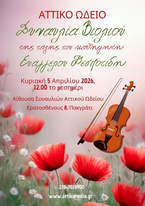 Συναυλία Βιολιού των σπουδαστών της τάξης του καθηγητή Ευάγγελου Δεσποτίδη θα πραγματοποιηθεί την Κυριακή των Βαΐων 5 Απριλίου 2026 στις 12.00 το μεσημέρι, στην αίθουσα συναυλιών του Αττικού Ωδείου, Ερατοσθένους 8 Παγκράτι.