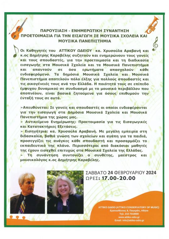 Οι Καθηγητές του Αττικού Ωδείου κα Χρυσούλα Αραβανή, με μεγάλη εμπειρία στη διδασκαλία και βαθιά γνώση των σχολείων & ο κος Δημήτριος Καραβέλης, εκπαιδευτικός, μουσικολόγος και συνθέτης, συζητούν και ενημερώνουν τους γονείς και τους σπουδαστές, για την προετοιμασία και τη διαδικασίας εισαγωγής στα Μουσικά Σχολεία και τα Μουσικά Πανεπιστήμια καθώς και για το νέο τρόπο εισαγωγής στα τμήματα Μουσικών Σπουδών, και απαντούν σε όσα ερωτήματα απασχολούν κάθε ενδιαφερόμενο.