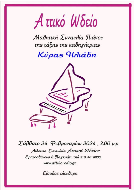 Συναυλία σπουδαστών Πιάνου της τάξης της καθηγήτριας Κύρας Ηλιάδη, θα πραγματοποιηθεί το Σάββατο 24 Φεβρουαρίου 2024 στις 3:00μμ στην αίθουσα συναυλιών του Αττικού Ωδείου, Ερατοσθένους 8, Παγκράτι.