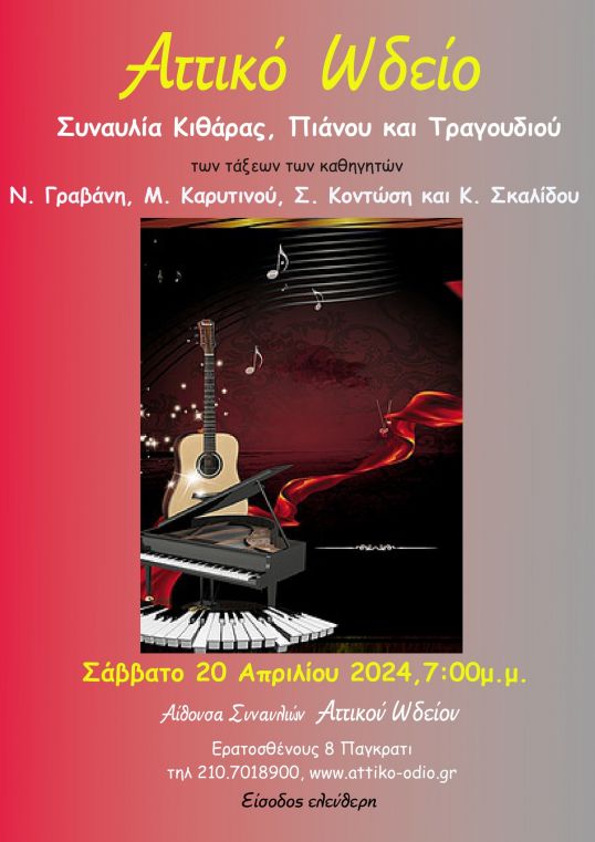 Συναυλία Κιθάρας, Πιάνου και Τραγουδιού με σπουδαστές των τάξεων των καθηγητών Νίκου Γραβάνη, Μαρίας Καρυτινού, Σοφίας Κοντώση και Κάθριν Σκαλίδου, θα πραγματοποιηθεί το Σάββατο 20 Απριλίου 2024 στις 7:00μμ στην αίθουσα συναυλιών του Αττικού Ωδείου, Ερατοσθένους 8, Παγκράτι.
