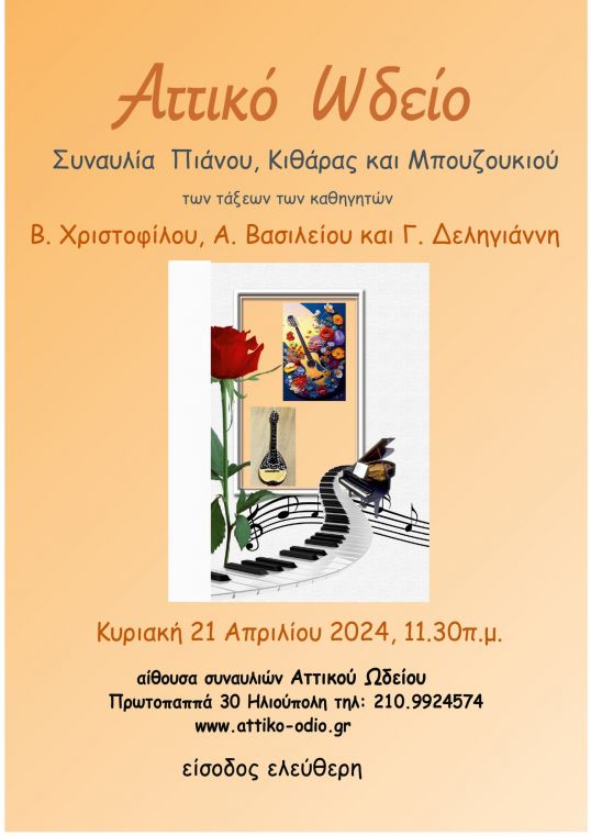 Συναυλία Πιάνου, Κιθάρας και Μπουζουκιού με σπουδαστές των τάξεων των καθηγητών Βίκυς Χριστοφίλου, Αντώνη Βασιλείου και Γιάννη Δεληγιάννη θα πραγματοποιηθεί την Κυριακή 21 Απριλίου 2024 στις 11:30πμ στην αίθουσα συναυλιών του παραρτήματος Ηλιούπολης του Αττικού Ωδείου, Πρωτοπαππά 30, Ηλιούπολη.