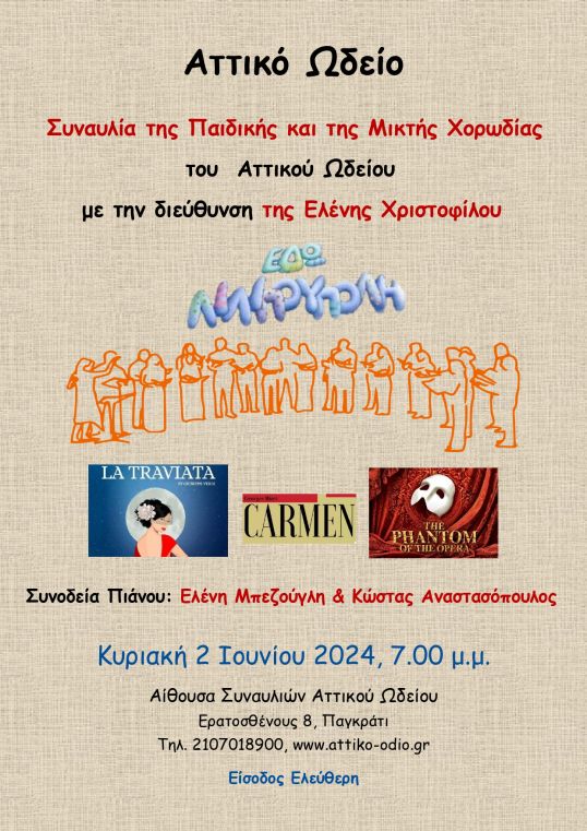 Συναυλία της Παιδικής και της Μικτής Χορωδίας του Αττικού Ωδείου θα πραγματοποιηθεί την Κυριακή 2 Ιουνίου 2024 στις 7.00μμ στην αίθουσα συναυλιών του Ωδείου, Ερατοσθένους 8 Παγκράτι, με τραγούδια από τη Λιλιπούπολη, χορωδιακά κομμάτια από τις όπερες Carmen & La Traviata και το Φάντασμα της Όπερας.