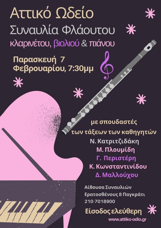 Συναυλία σπουδαστών Φλάουτου, Κλαρινέτου, Βιολιού και Πιάνου των τάξεων των καθηγητών Νίκου Κατριτζιδάκη, Μανούσου Πλουμίδη, Γεώργιου Περιστέρη, Κων/νας Κωνσταντινίδου και Διονύση Μαλλούχου, θα πραγματοποιηθεί την Παρασκευή 7 Φεβρουαρίου 2025 στις 7:30μμ στην αίθουσα συναυλιών του Αττικού Ωδείου, Ερατοσθένους 8, Παγκράτι.