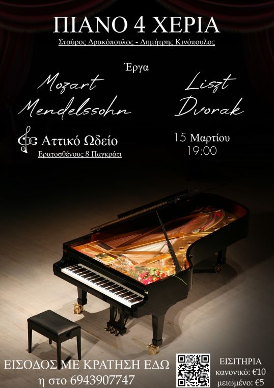 Ρεσιτάλ Πιάνου για 4 χέρια με τους Σταύρο Δρακόπουλο και Δημήτρη Κινόπουλο, με έργα Mozart, Mendelssohn, Liszt & Dvorak, θα πραγματοποιηθεί το Σάββατο 15 Μαρτίου 2025 στις 19.00, στην αίθουσα συναυλιών του Αττικού Ωδείου, Ερατοσθένους 8 Παγκράτι. Κρατήσεις θέσεων: 6943907747