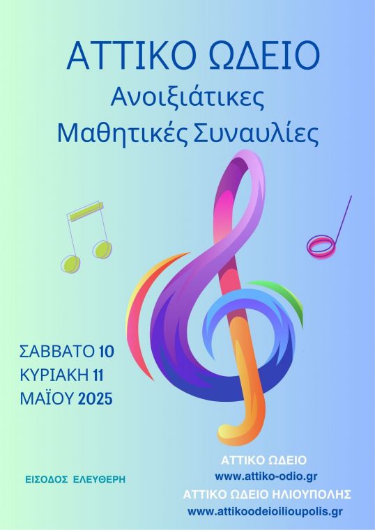 Ανοιξιάτικες Μαθητικές Συναυλίες θα πραγματοποιηθούν, το Σάββατο 10 Μαΐου στο Αττικό Ωδείο Ηλιούπολης και την Κυριακή 11 Μαΐου στο Κεντρικού Ίδρυμα του Αττικού Ωδείου: