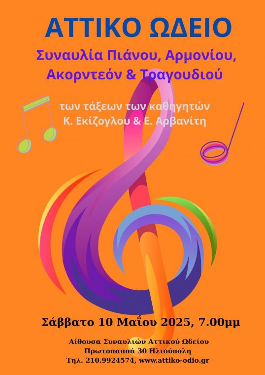 Σάββατο 10 Μαΐου 2025, 7:00μμ: Συναυλία Πιάνου, Αρμονίου, Ακορντεόν και Τραγουδιού με σπουδαστές των τάξεων των καθηγητών Κώστα Εκίζογλου και Έλλης Αρβανίτη