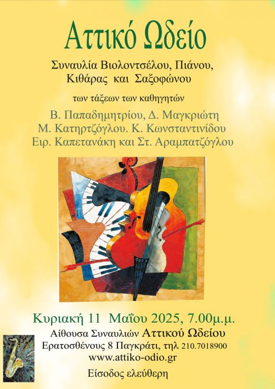 Κυριακή 11 Μαΐου 2025, 7:00μμ: Συναυλία βιολοντσέλου, πιάνου, κιθάρας και σαξοφώνου, των τάξεων των καθηγητών Βάνιας Παπαδημητρίου, Δημήτριου Μαγκριώτη, Μαρίας Κατηρτζόγλου, Κωνσταντίνας Κωνσταντινίδου, Ειρήνης Καπετανάκη και Στέλλας Αραμπατζόγλου..