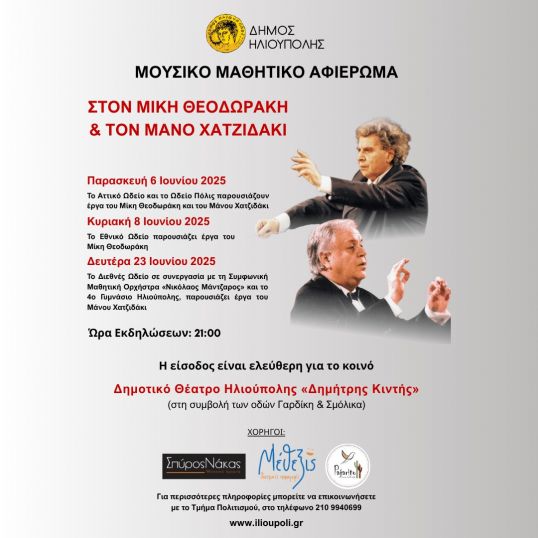 Ο Δήμος Ηλιούπολης και τα Ωδεία της πόλης, με αφορμή τα 100 χρόνια από τη γέννηση του Μίκη Θεοδωράκη και του Μάνου Χατζιδάκι, παρουσιάζουν ένα ΜΟΥΣΙΚΟ ΜΑΘΗΤΙΚΟ ΑΦΙΕΡΩΜΑ για το έργο των δύο εμβληματικών καλλιτεχνών.